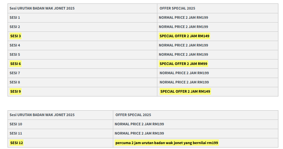 2. Harga Batch customer 2025 Urutan Badan Wak Jonet 2 Jam RM199