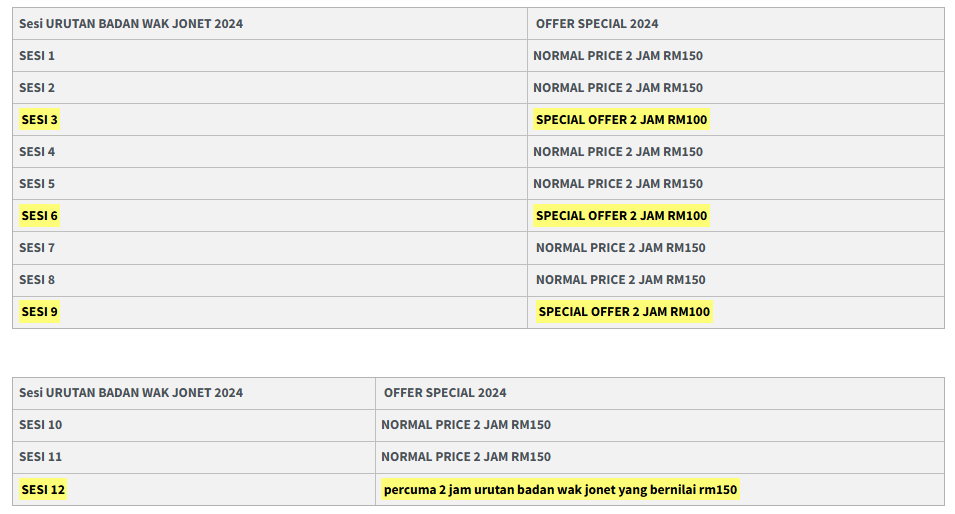 1. Harga Batch customer 2024 Urutan Badan Wak Jonet 2 Jam RM150