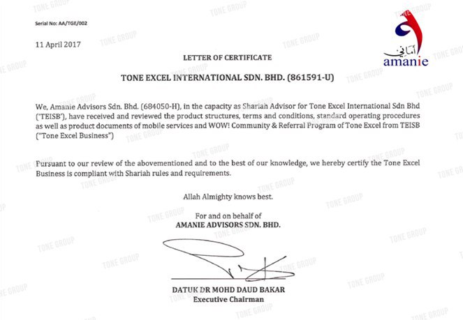 Dalam kenyataan rasmi Amanie Advisors, mereka menyatakan pihak Tone Group telah melantik Amanie Advisors untuk melakukan proses semakan Syariah ke atas produk simkad syarikat iaitu Tone Excel. Lantikan tersebut telah berlaku sejak suku ke 4 tahun 2016.