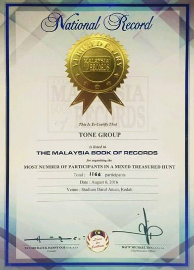 TONE GROUP telah mencipta rekod pada 2016 dgn jumlah penyertaan Treasure Hunt terbesar di Malaysia iaitu 1,166 penyertaan.
