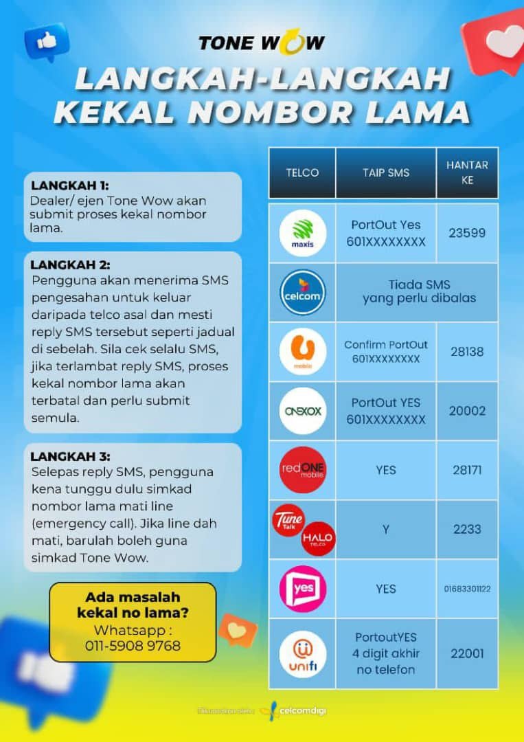 Boleh follow tutorial di bawah untuk kekalkan nombor lama cuma nak ke ToneWow Powerwed by CelcomDigi